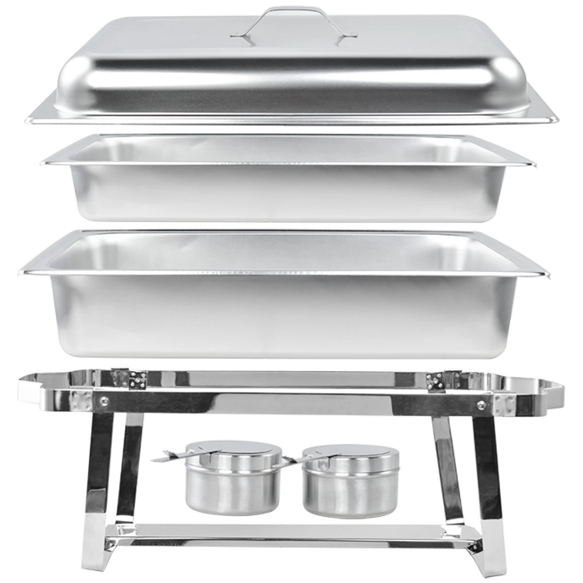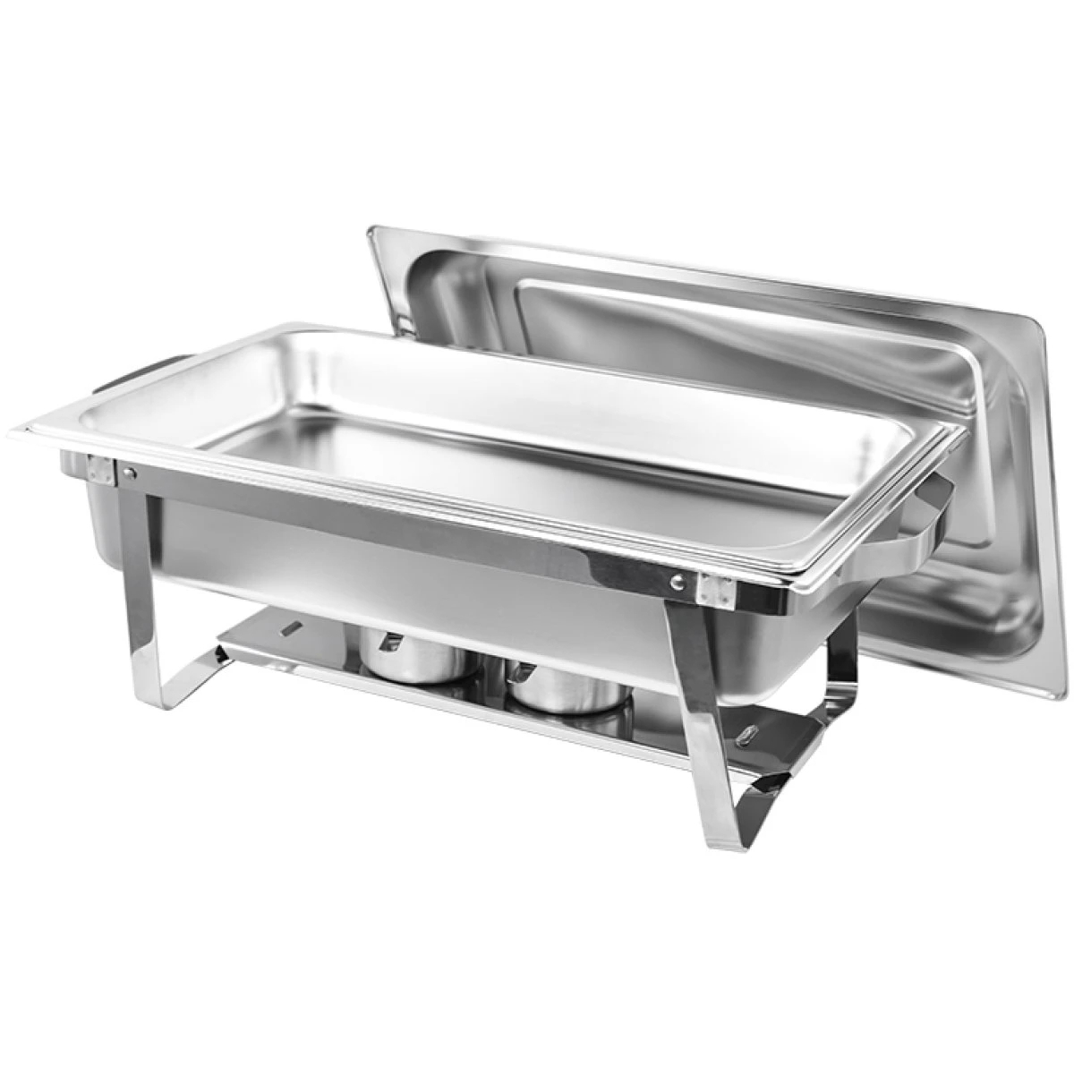 A commercial stainless steel 1/1 gastronorm sized professional chafer set with water pan, nine litre food pan, cover and two fuel holders.
