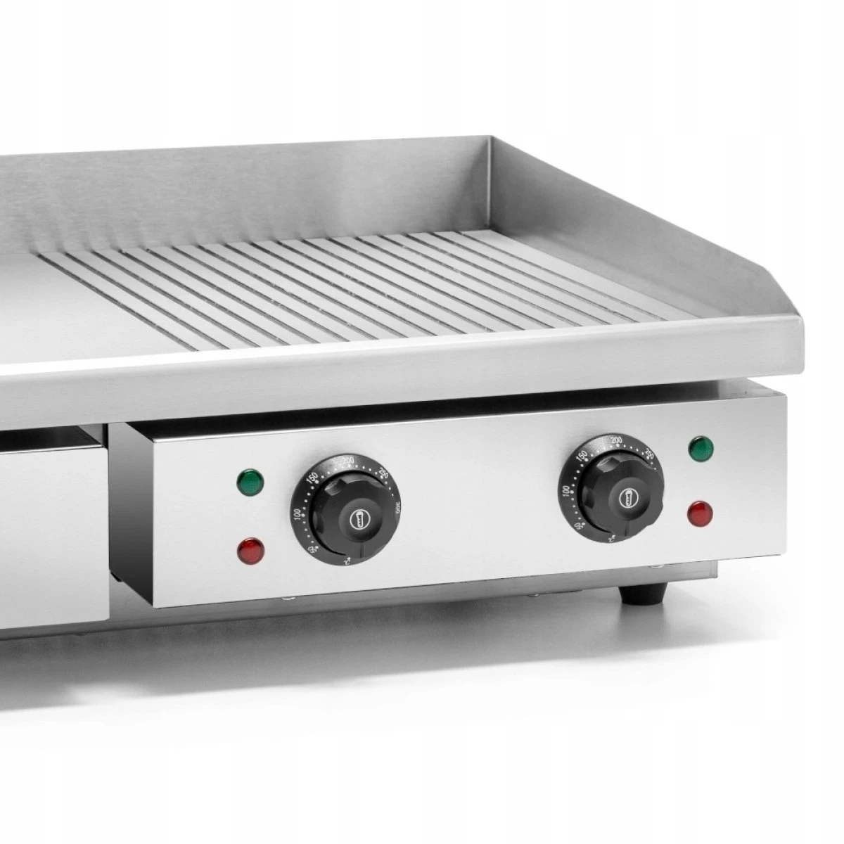 Powerful and reliable, this professional steel griddle features a generously sized steel cooking surface that is smooth and ribbed, perfect for breakfast, lunch or dinner services. The heavy duty elements ensure a rapid heat up and an even spread of heat across the wide griddle surface. With simple dial thermostat control and removable fat collection drawer, the restaurant griddle is incredibly easy to use, clean and maintain. This catering fry top is an incredible bargain at the current discount sale price.