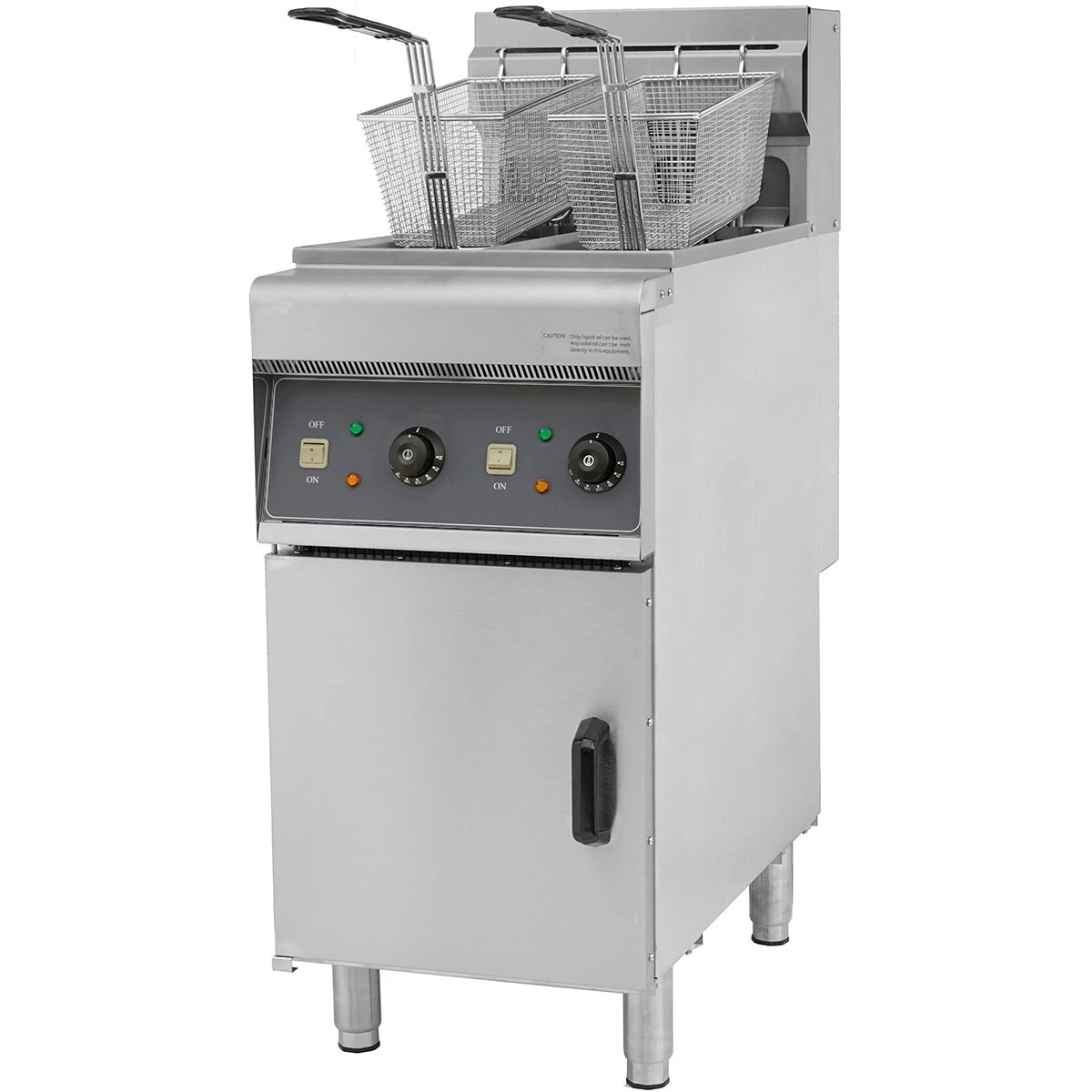 This super heavy duty commercial fryer is manufactured with stainless steel and sturdy adjustable feet, this unit is equipped with a buzzer timing function for reminding purposes and a cold zone to prolong the life to maximise your profit. The heating element can be easily lifted for easy cleaning of food debris which is accumulated in the cold zone. Perfect for frying large quantities of chips, seafood, chicken and many other foods providing versatility and precision which is vital in today’s catering and restaurant kitchens.